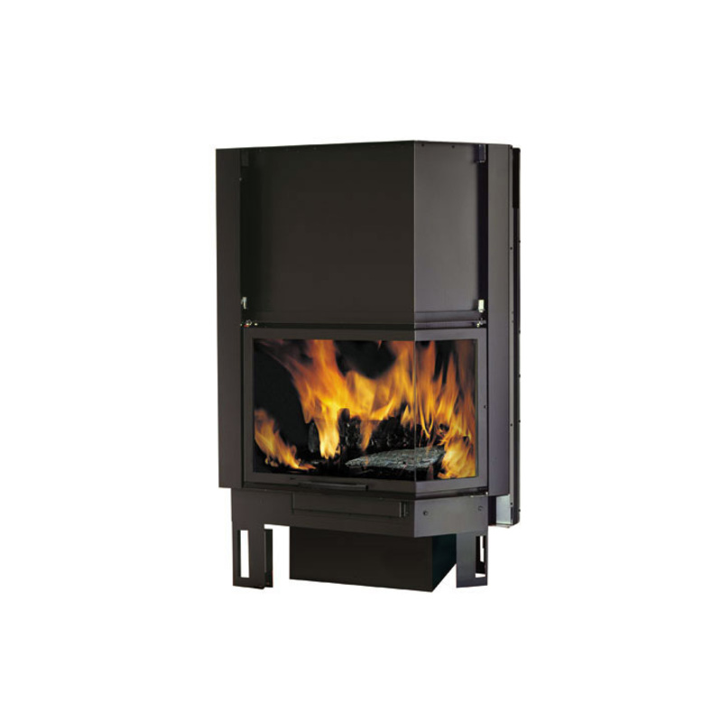 High-performance monoblock hob with sliding door, extremely rational and simple. This is a really hot air heater. It produces large amounts of hot air that can be directed to adjacent rooms with aluminum hoses. The circulation of the heating air can be done: – by natural traction (CN) – by the use of the special fan kit (VF). The hearth offers ample views of the fire on both sides with ceramic glass. It is ideal for mounting in a corner, left or right.