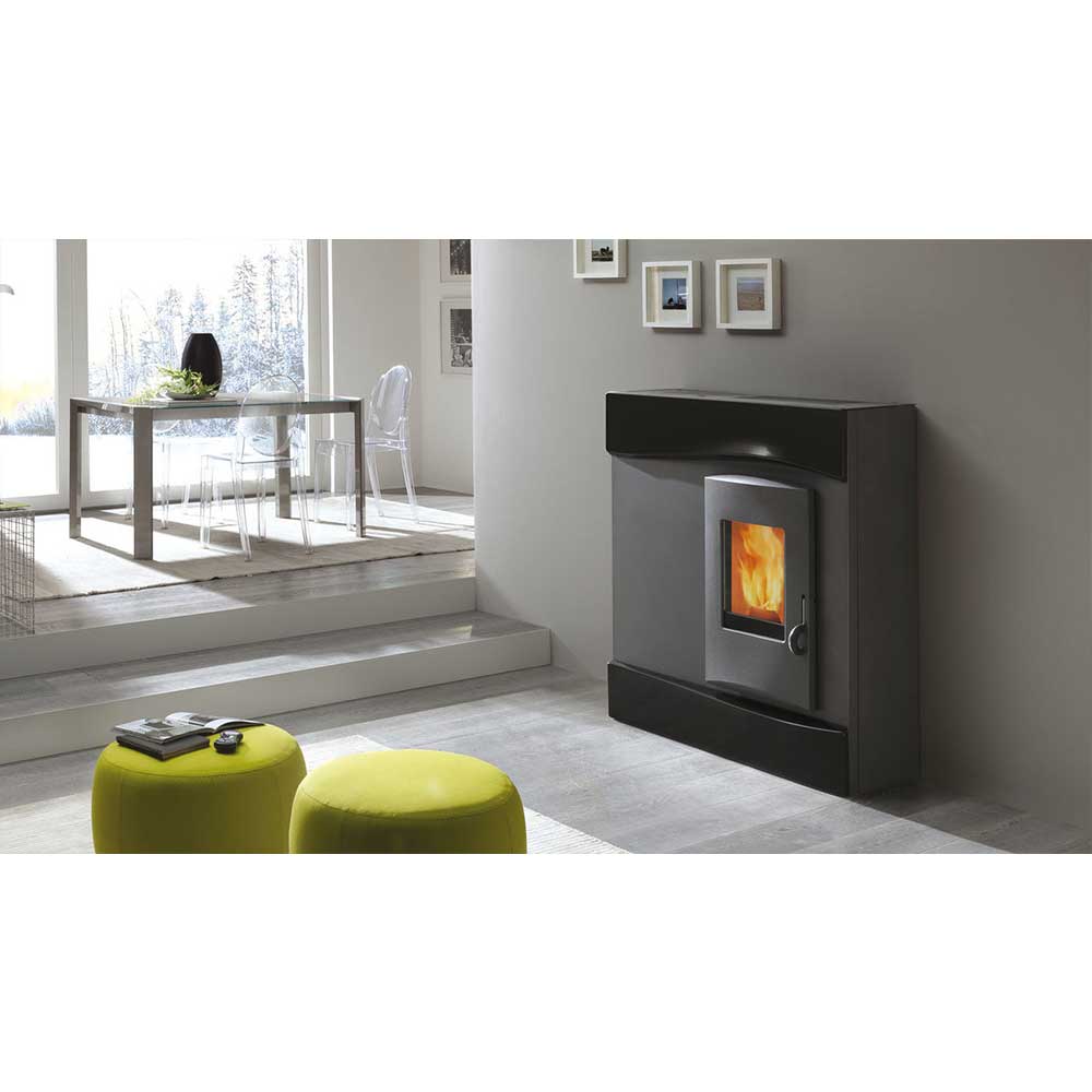 Pellet radiator stove with original design with embossed “wave” that feeds the heating network and radiators (high temperature) and the underfloor heating (low temperature).